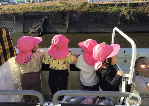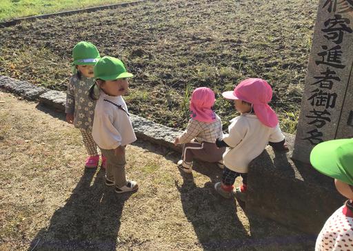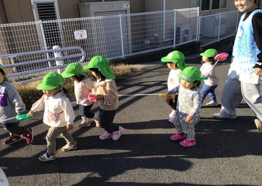 黄緑帽子のつくし組(1歳児)さん、4月にはまだ小さかった皆が、今ではしっかり歩いてお散歩です。桃色帽子のめだか組(0歳児)さんは、散歩車で一緒にお出かけです。