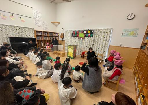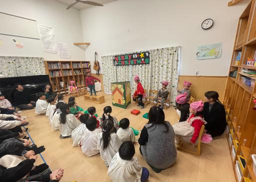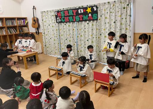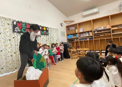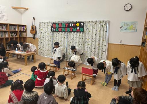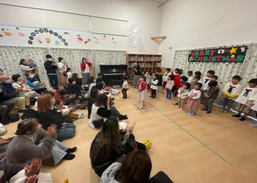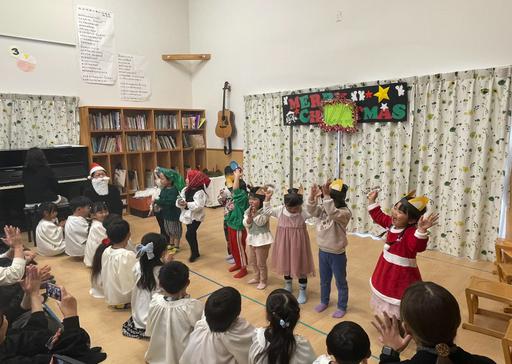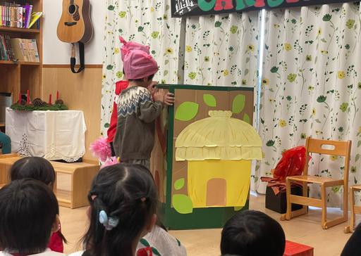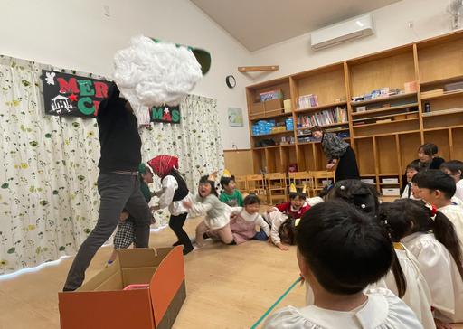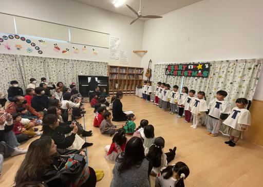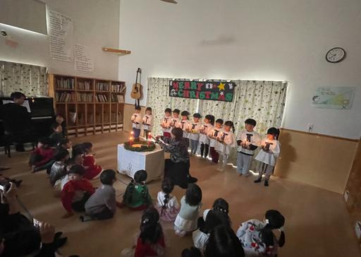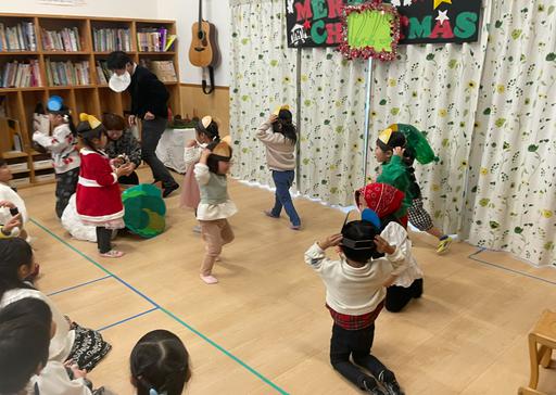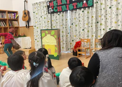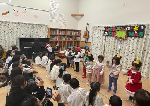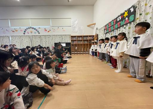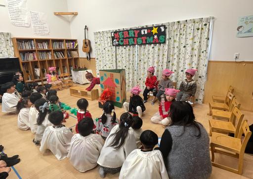 れんげ・こすもす・すみれ組(年少・年中・年長)さんのクリスマス会は、愛児園がずっと続けているページェント(降誕劇)から始まります。厳かな雰囲気の後は、劇をしたり歌ったり踊ったり…みんなで賑やかにクリスマスをお祝いしました。