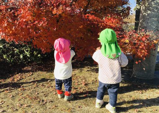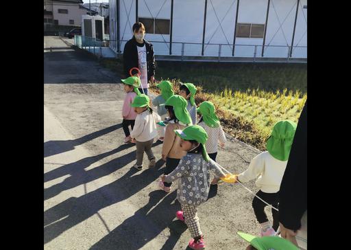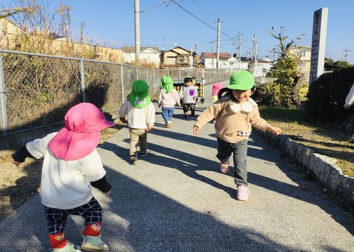 黄緑帽子のつくし組(1歳児)さん、4月にはまだ小さかった皆が、今ではしっかり歩いてお散歩です。桃色帽子のめだか組(0歳児)さんは、散歩車で一緒にお出かけです。