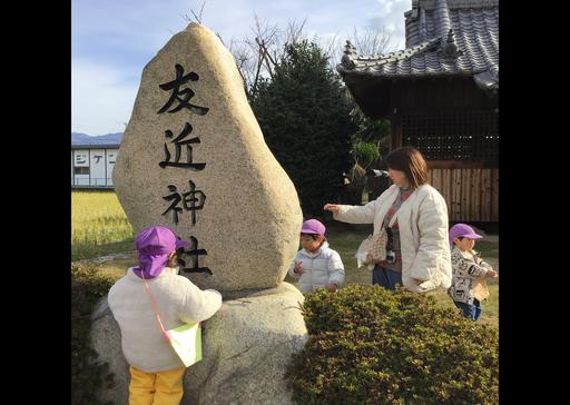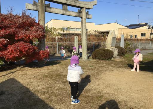 たんぽぽ組(2歳児)さんのお気に入りスポット、友近神社。毎日のように遊びに行っています。小さな小さな境内ですが、みんなにとっては今日もわくわくがいっぱいです♪
