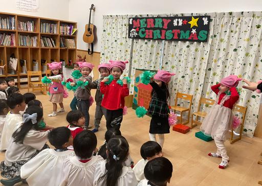 れんげ・こすもす・すみれ組(年少・年中・年長)さんのクリスマス会は、愛児園がずっと続けているページェント(降誕劇)から始まります。厳かな雰囲気の後は、劇をしたり歌ったり踊ったり…みんなで賑やかにクリスマスをお祝いしました。